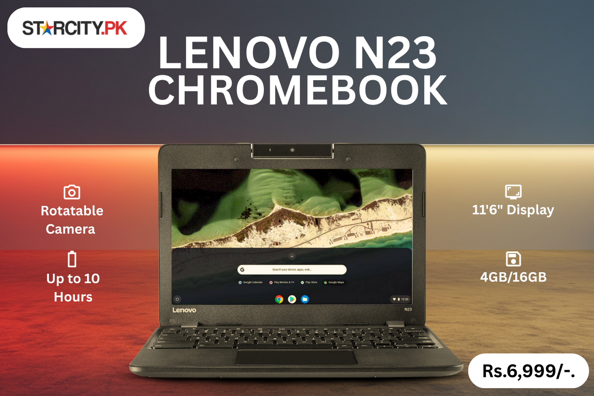 Lenovo N23 Chromebook price in Pakistan Rs.6,999/-. The Lenovo N23 Chromebook is well-known for its long battery life and versatile features, making it a top pick in budget laptops. With an 11.6-inch HD display, Intel Celeron processor, and 4GB RAM, it runs smoothly for daily tasks like studying, browsing, and office work. Its up to 10 hours of battery backup ensures all-day use without frequent charging. A standout feature is its rotatable camera, which adds flexibility for video calls and creative use. Lightweight and durable, the N23 is an excellent choice for students and professionals seeking portability and reliability.