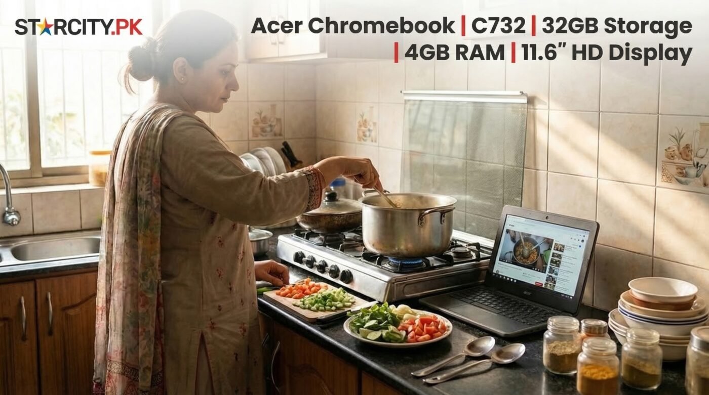 Acer Chromebook C732 Price in Pakistan Rs.6,999/-. Despite the low price, it offers a surprisingly balanced set of features. It comes with an 11.6-inch HD display with a resolution of 1366 × 768 pixels. This screen size makes the device compact and portable while still offering clear visuals for browsing and videos. The laptop is powered by the Intel Celeron N3350 processor, which can reach speeds up to 2.4 GHz. While not designed for heavy workloads, it performs smoothly for everyday Chromebook tasks.