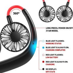 - HAND FREE DESIGN: This unique design sets your hands free. You will wear the USB fan around your neck. Light weight of 246g makes it super comfortable to wear on your neck for a long time. Stylish design and quality finish make you stand out in the crowd. You will want to take it anywhere in hot weather. Prefect for any indoor and outdoor use.